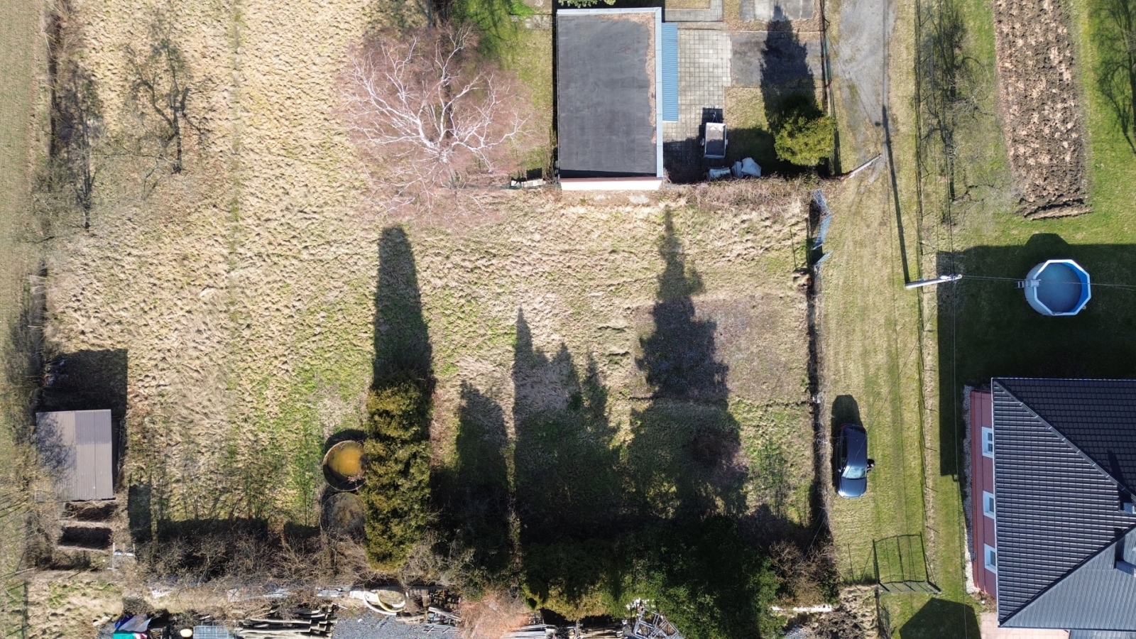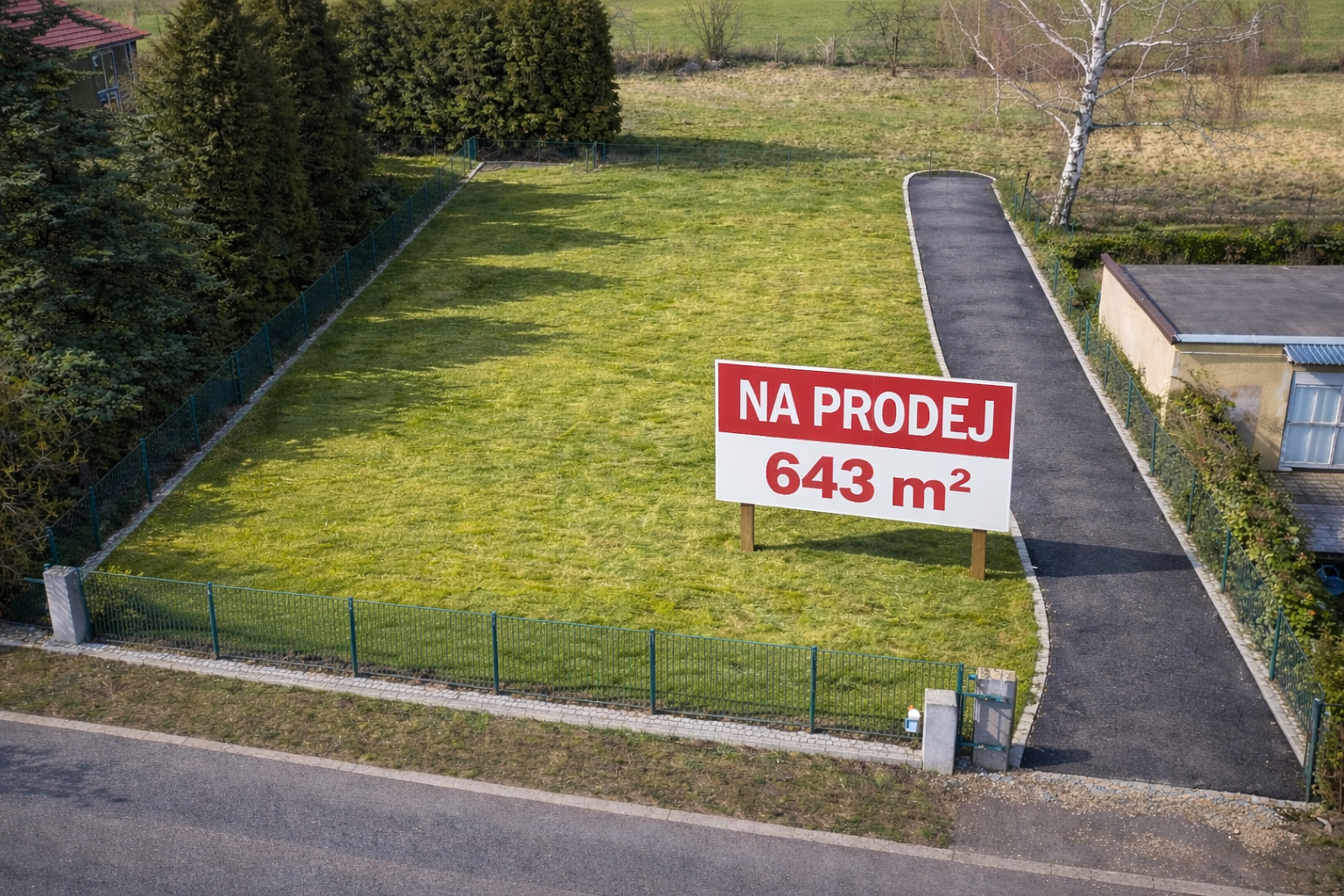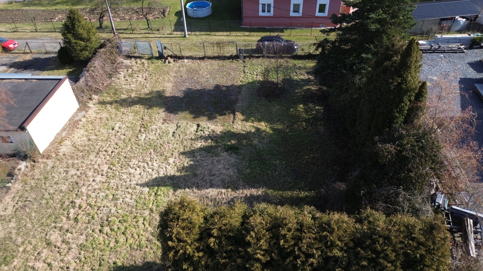 Pozemek má výměru cca 643 m² (rozměry přibližně 36 × 20 m) a je z poloviny oplocený. Přístup k pozemku je zajištěný podílem na cestě.