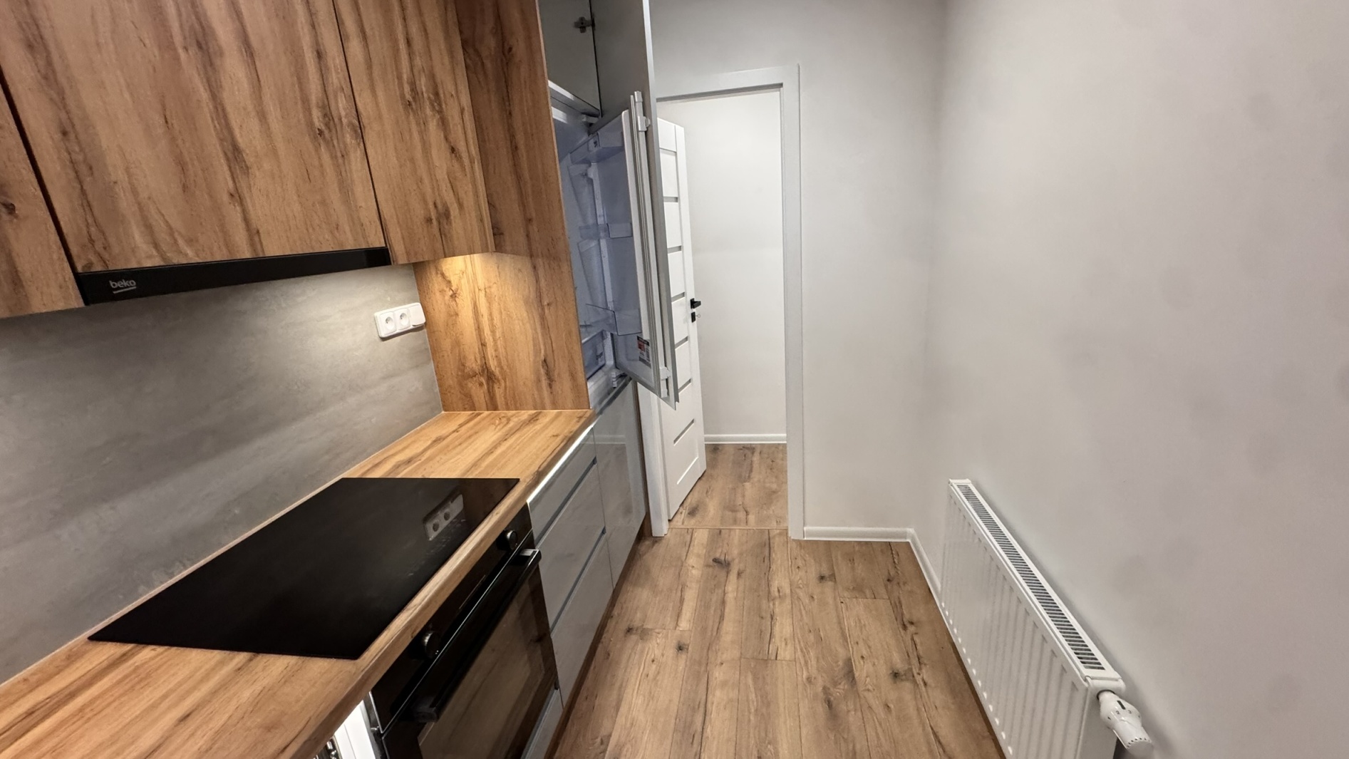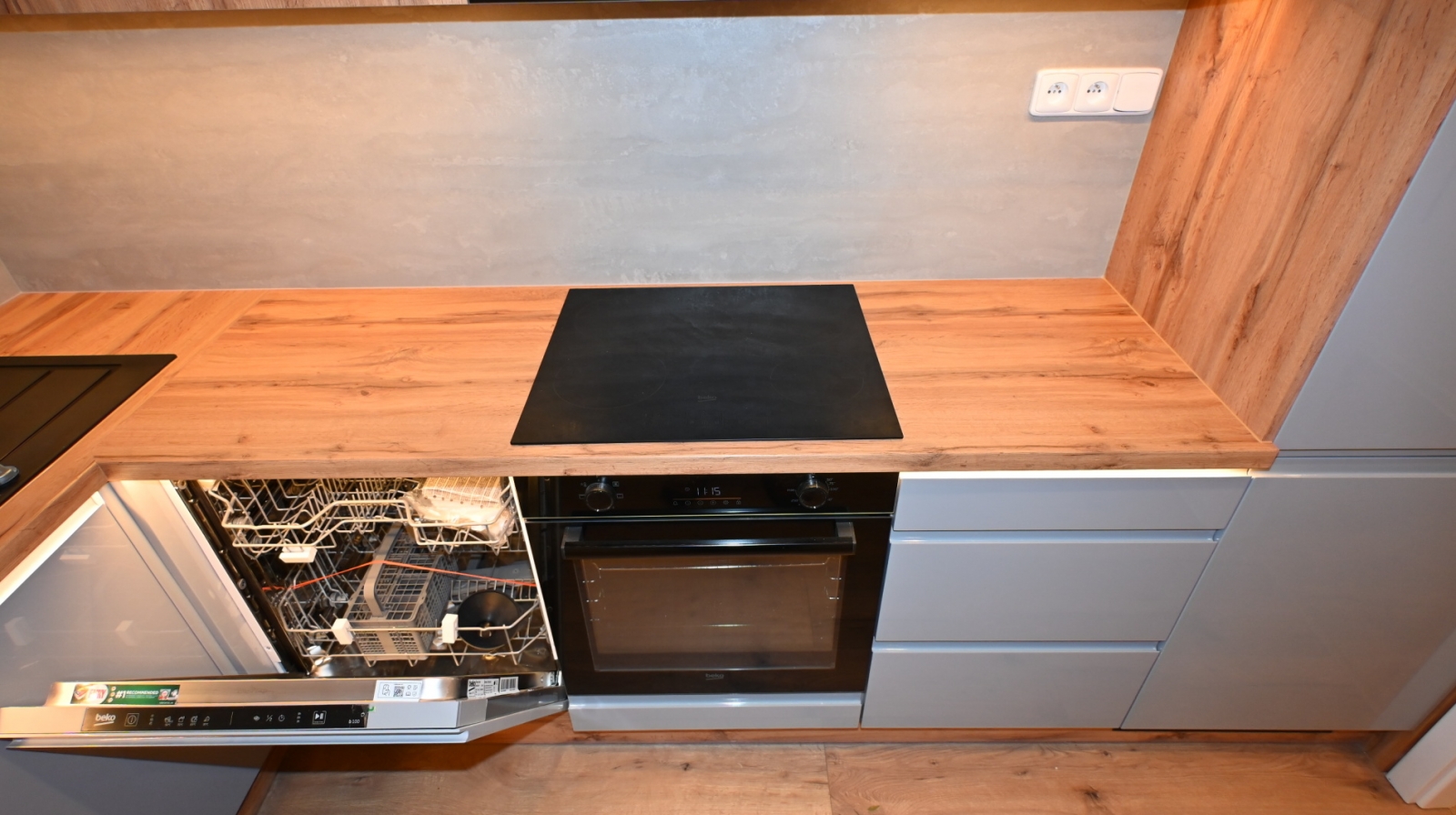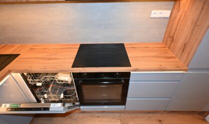 nová kuchyňská linka s vestavěnými spotřebiči (myčka, lednice, indukční varná deska, multifunkční elektrická trouba)