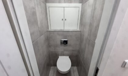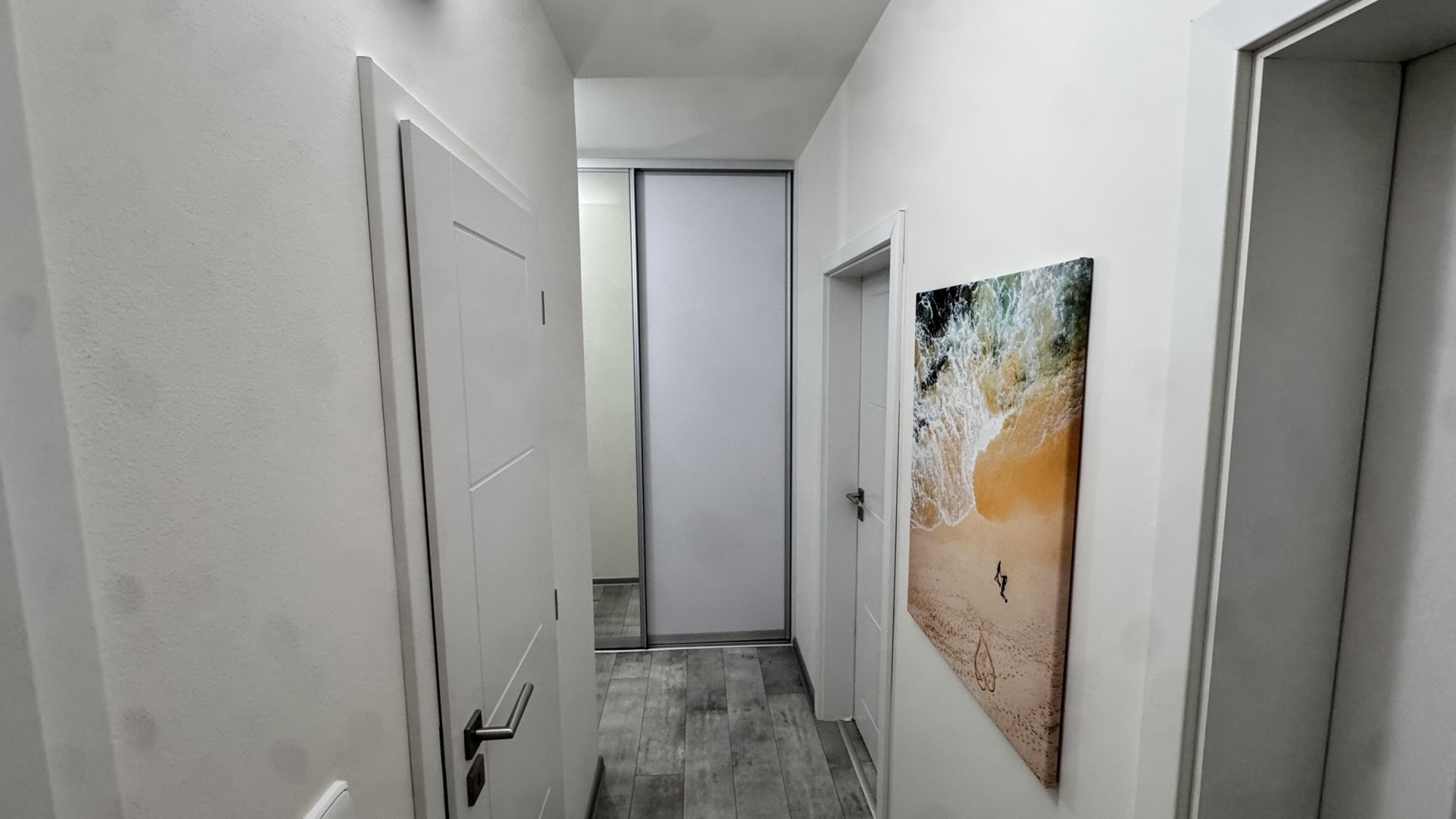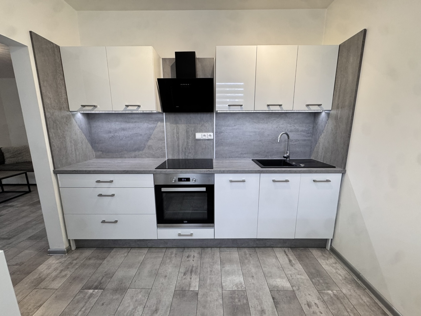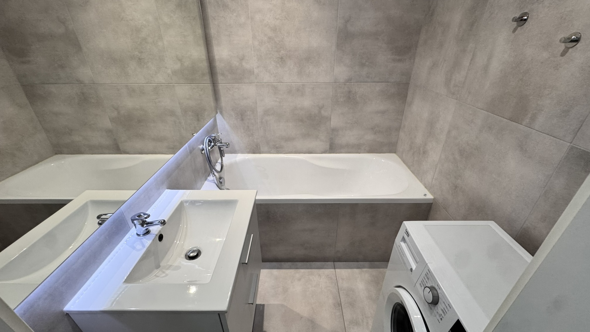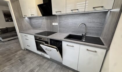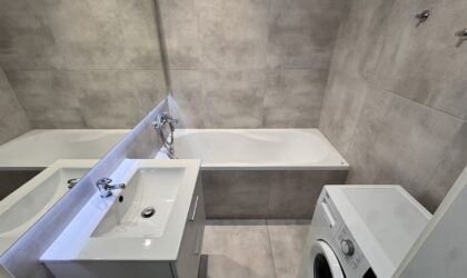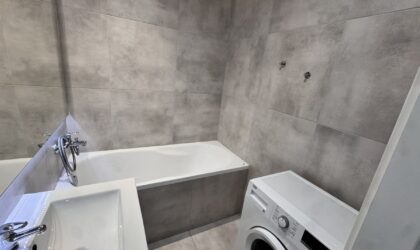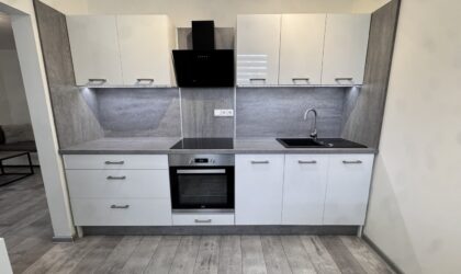 Srdcem bytu je moderní kuchyňská linka s kováním Blum, která je vybavena vestavnými spotřebiči – sporákem, myčkou nádobí, lednicí a mikrovlnnou troubou. Pračka je umístěna v koupelně. Koupelna je řešena novým zděným bytovým jádrem, disponuje vanou a odvětráváním. Toaleta je samostatná a designově sladěná s koupelnou. Velkou výhodou jsou vestavné skříně v chodbě a další úložný prostor v dětském pokoji.